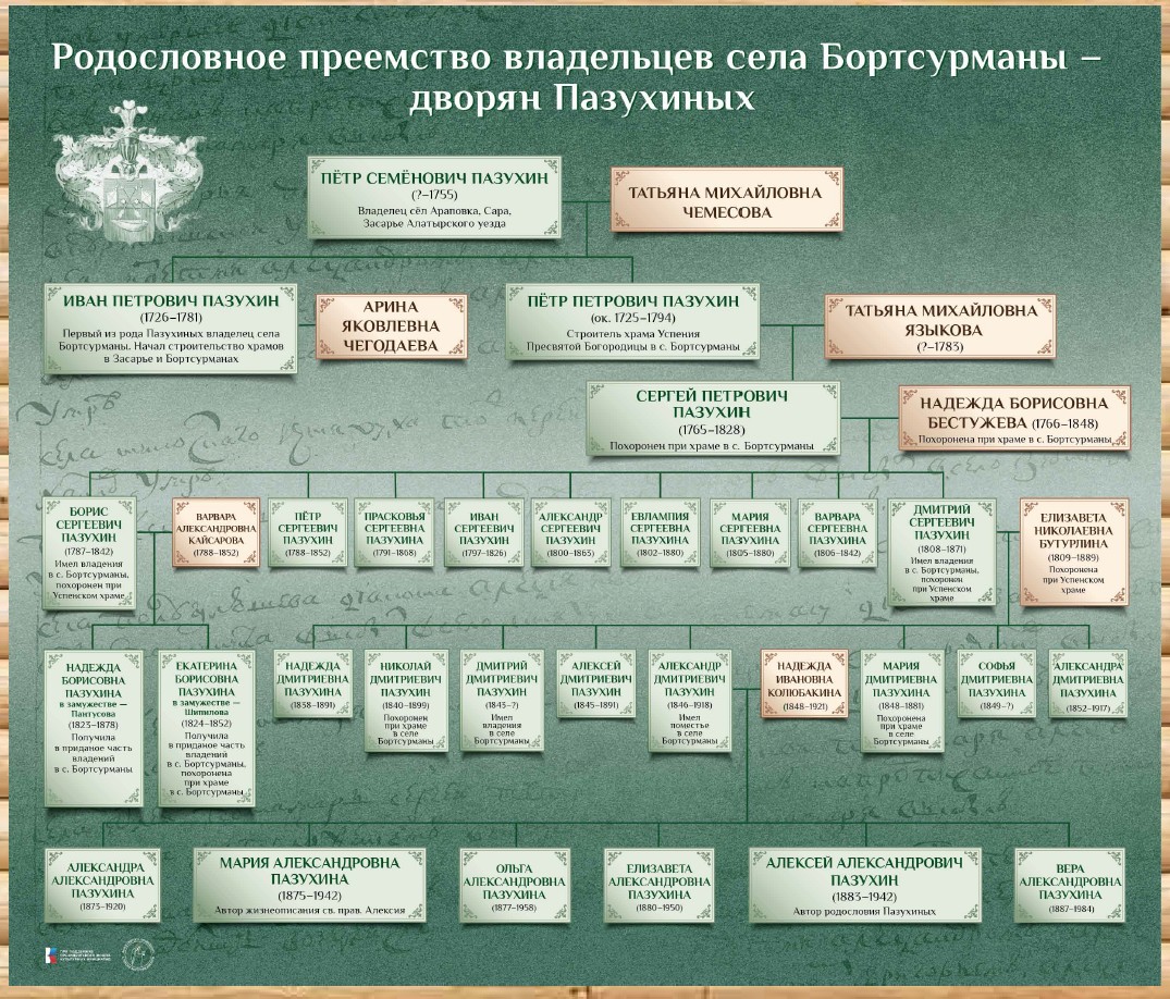 Сергей Петрович Пазухин (1765–1828) – сын строителя храма Петра Петровича. Родился в 1765 г. Служил в лейб-гвардии Преображенском полку. Имел поместья в Курмышском уезде в сёлах Бортсурманы и Свинуха, в Алатырском уезде – в сёлах Сара, Засарье и Араповке. Он был женат на Надежде Борисовне Бестужевой (1766–1848). От этого брака родилось девять детей: Борис, Пётр, Прасковья, Иван, Александр, Евлампия, Мария, Варвара, Дмитрий.