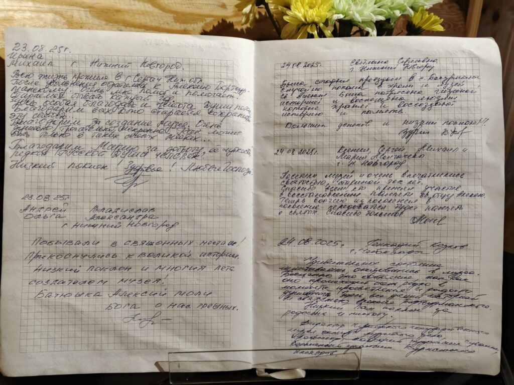 «Милостью Божией, грешный о. Феодосий сегодня побывал в этом музее. Окунувшись ненадолго в атмосферу того времени и узнав много подробностей о святом батюшке Алексее. За подробную экскурсию и рассказ премного благодарю р. Б. Марию! Очень рад, что Господь сподобил меня, грешного, побывать в этом святом месте! Конец и Богу слава!»