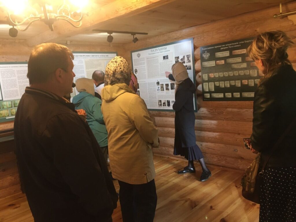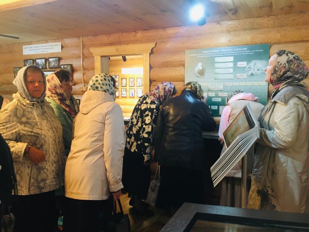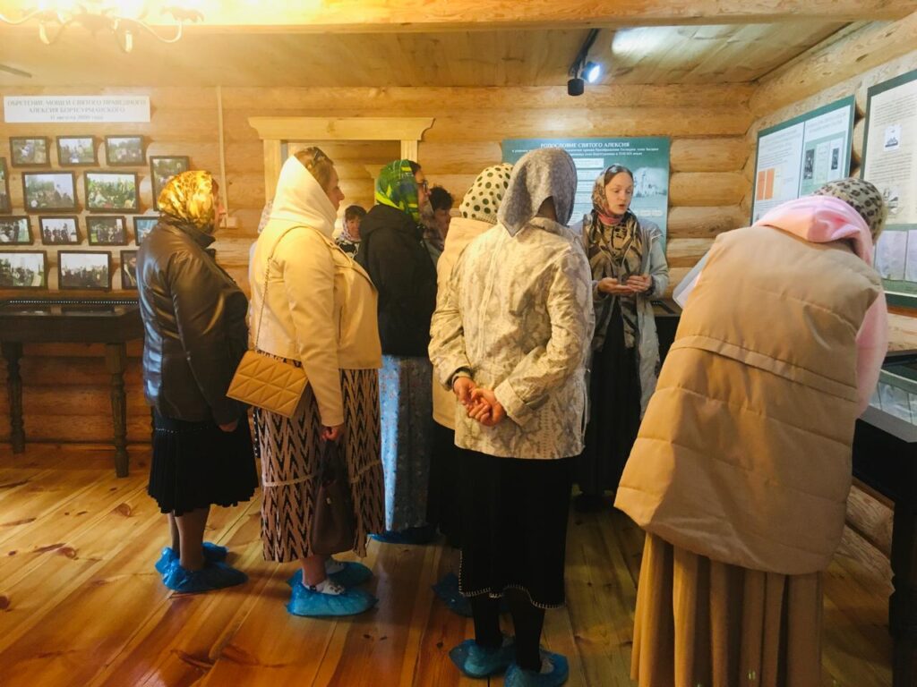 «После службы паломническая группа побывала в музее, где воссоздана келья святого праведного Алексия Бортсурманского – кровать, печка, святой угол с иконами, столик для письма и даже камень, который, по описаниям жития, клал в себе в ноги отец Алексий во время сна и прятал под дерюгой на своей кровати. В музее хранится дневник святого бортсурманского праведника, его личные вещи, найденные при обретении мощей, родословное древо и фотографии помещиков Пазухиных, владеющих селом Бортсурманы, картины, написанные на пленэрах, прочие исторические экспонаты. Музей небольшой, состоит из трех комнат, но очень уютный и светлый. Из окна кельи Батюшки Алексия виден храм Успения Пресвятой Богородицы. Совсем так, как описано в его Житии. Музей Святого Праведного Алексия Бортсурманского был торжественно открыт совсем недавно – 17 августа, в 25-ю годовщину обретения мощей Святого Батюшки Алексия.