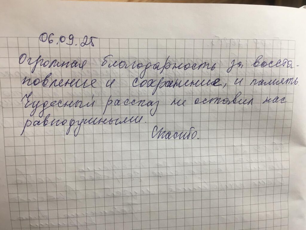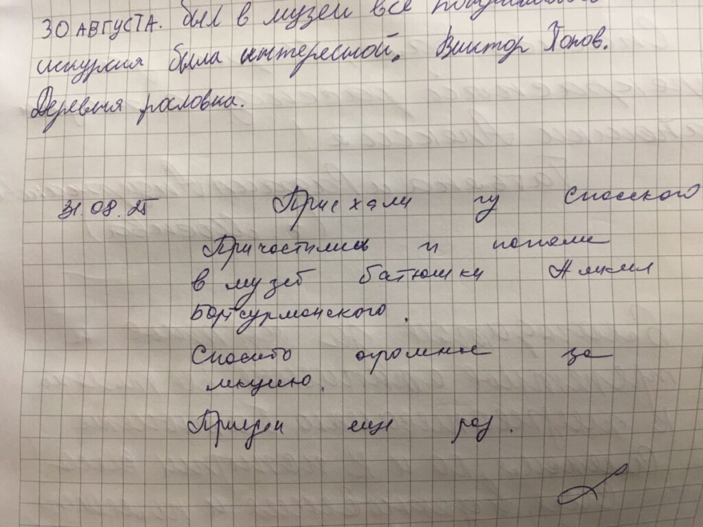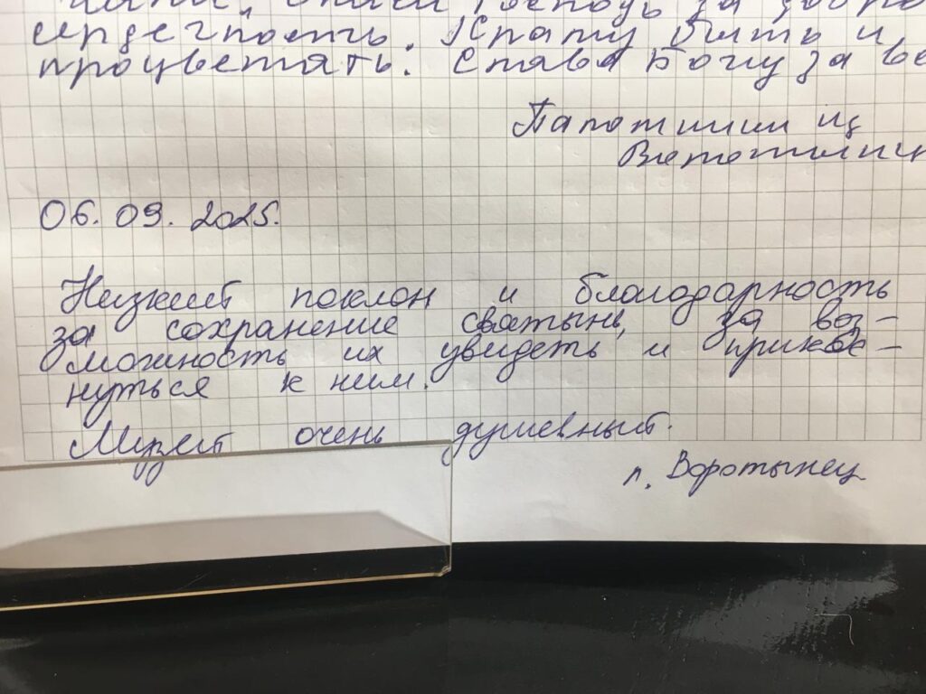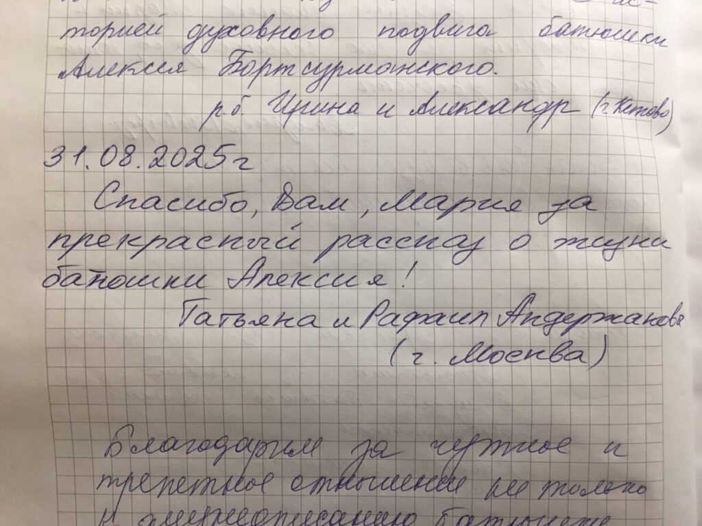 «Очень благодарны за создание чудесного музея. Неоднократно приезжали в с. Бортсурманы к св. о. Алексию для молитвы и почитания. Создание музея, прекрасный рассказ и проведение экскурсии позитивно повлияли на подробное изучение жития св. Алексия.