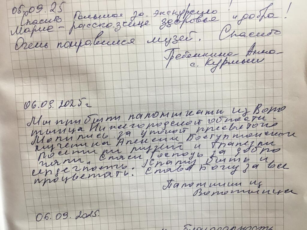 За первую неделю сентября музей посетило и несколько организованных групп — гости из реабилитационного центра посёлка Пильна, большая группа прихожан из Воротынца, посетители из г. Шумерля. Приходят местные жители, приезжают москвичи, чебоксарцы, петербуржцы, оставляют благодарные отзывы, делятся подробностями в соцсетях: