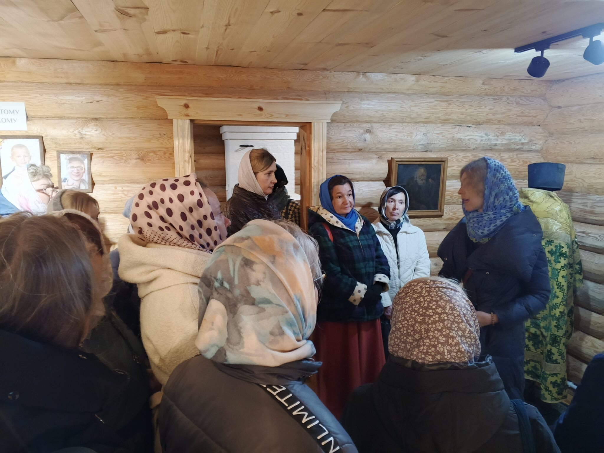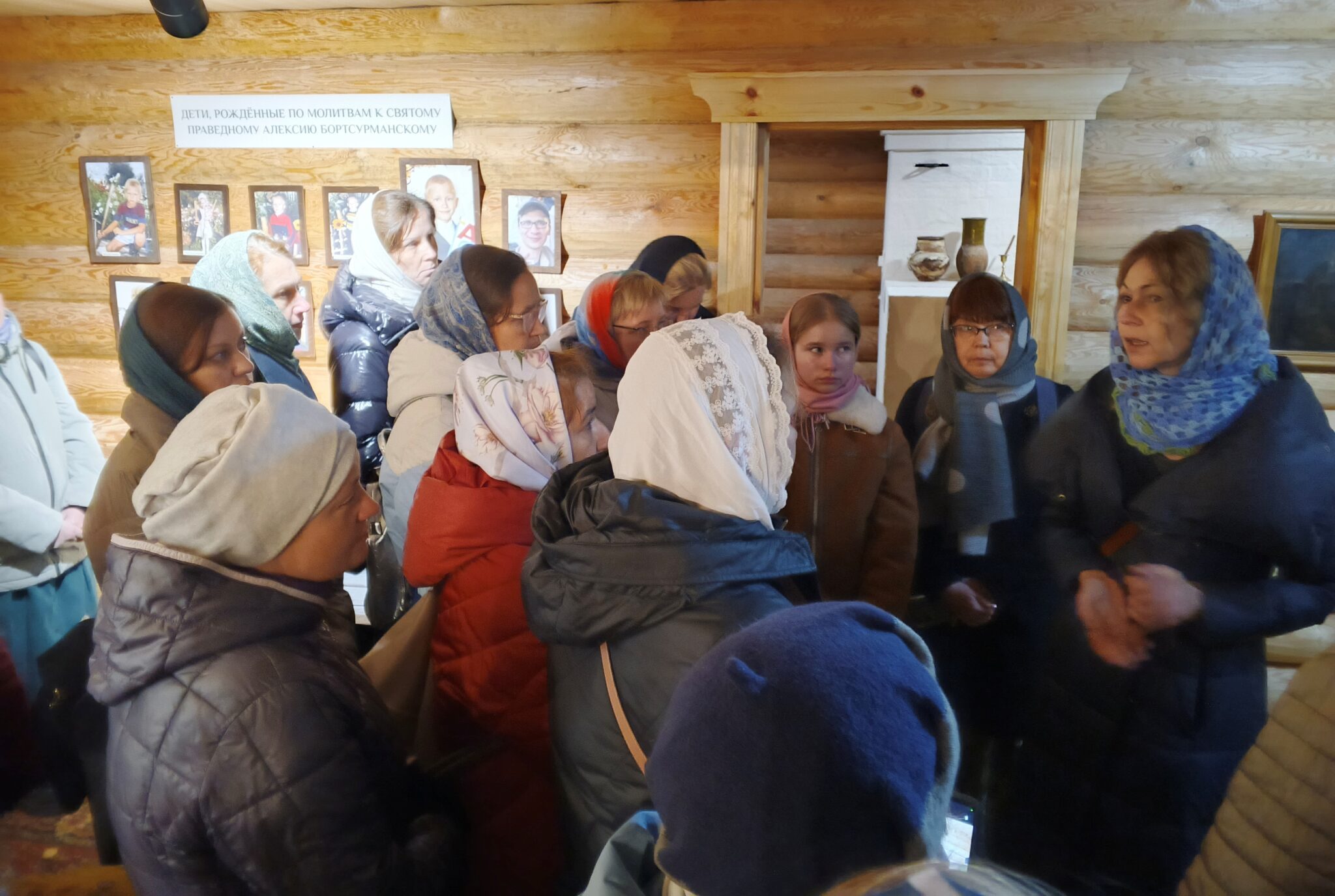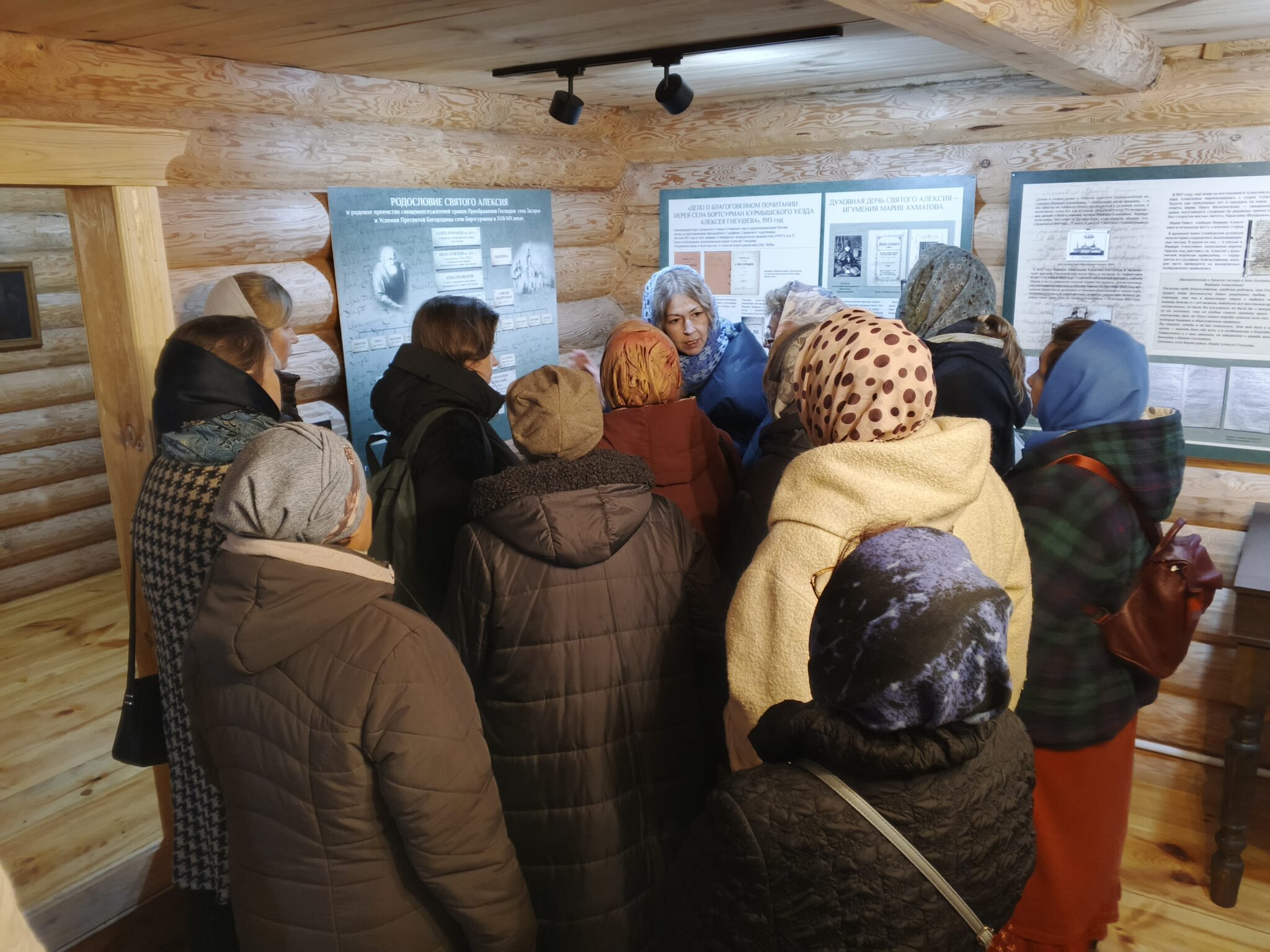 А дальше нашим экскурсоводам – Александрине Владимировне Вигилянской и Елене Павловне Смирновой  – предстояло провести для паломников экскурсии по храму и музею праведника. Дело непростое: не каждый день мы принимаем сто человек одновременно. Гостей разделили на две большие группы: пока часть из них трапезничала, другие распределились между матушкой Еленой, пригласившей паломников на уличную экскурсию по истории храма и его священнослужителей с посещением места могилки праведника, и Александриной, принимавшей гостей Доме-музее святого Алексия. Затем группы поменялись местами, а после экскурсий отправились на трапезу. Настал черёд второй половины гостей, которые точно так же по очереди побывали и в музее святого Алексия, и на уличной экскурсии.