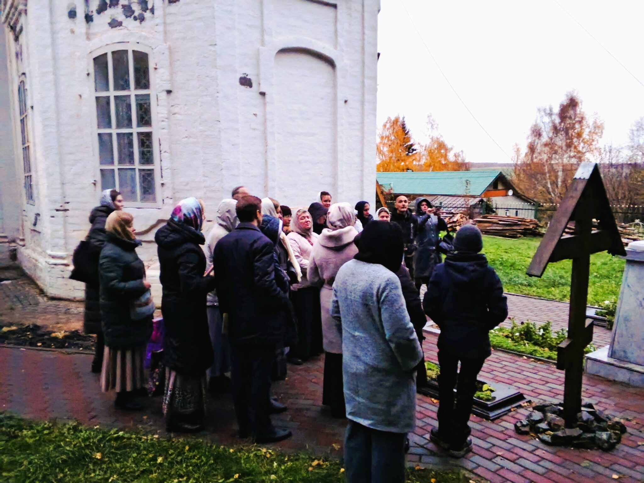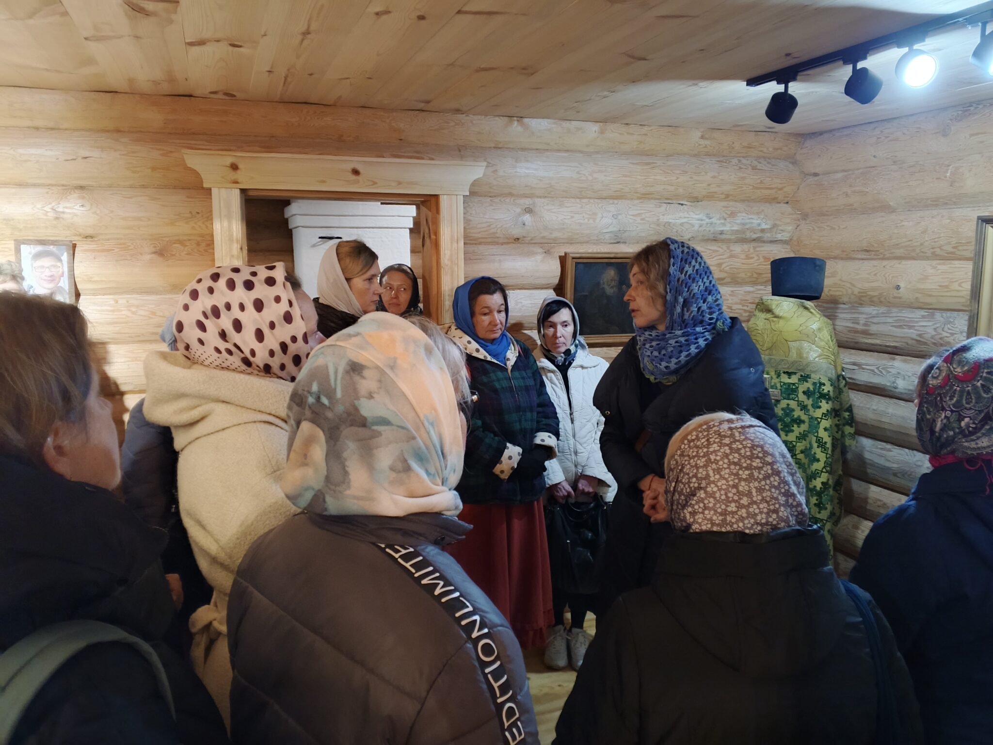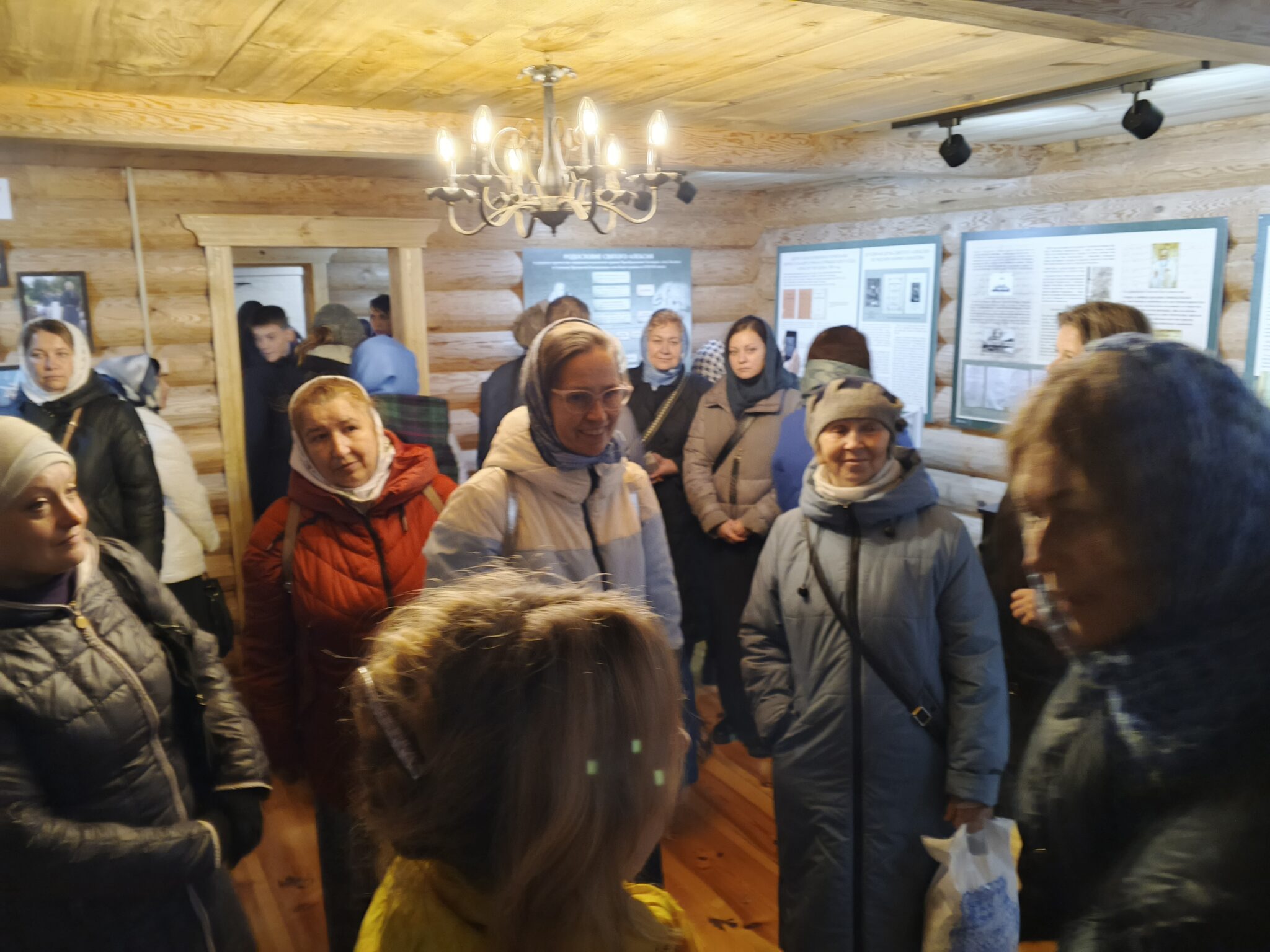 А дальше нашим экскурсоводам – Александрине Владимировне Вигилянской и Елене Павловне Смирновой  – предстояло провести для паломников экскурсии по храму и музею праведника. Дело непростое: не каждый день мы принимаем сто человек одновременно. Гостей разделили на две большие группы: пока часть из них трапезничала, другие распределились между матушкой Еленой, пригласившей паломников на уличную экскурсию по истории храма и его священнослужителей с посещением места могилки праведника, и Александриной, принимавшей гостей Доме-музее святого Алексия. Затем группы поменялись местами, а после экскурсий отправились на трапезу. Настал черёд второй половины гостей, которые точно так же по очереди побывали и в музее святого Алексия, и на уличной экскурсии.